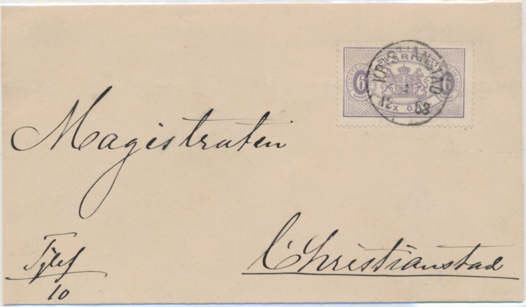 Lokalbrev skickat inom Kristianstad 1883 frankerat med tandning 13 i a-nyans.
