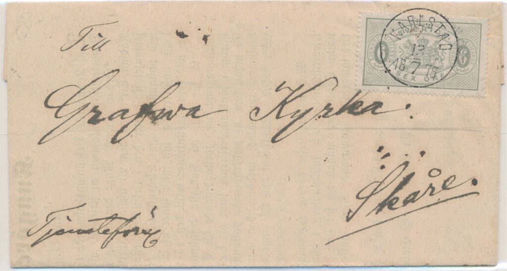 Inrikes trycksak i 1:a vk från KARLSTAD 13.7.1875 till Skåre frankerad med 6 öre tandning 14 i c-nyans.