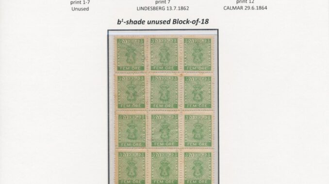 Här inleds öre valörerna med provtryck och färgprover. Följt av beskrivning av tillverkningen illustrerat med ett 24 öre 3-strip med marginalvattenmärke och det unika dubbeltandade 50 öre paret. Därefter följer valören 5 öre där flera ovanliga frankeringar visas samt en sällsynt stor enhet med 1855 års tandning. Ramen avslutas med de första bladen för 9 öre valören.